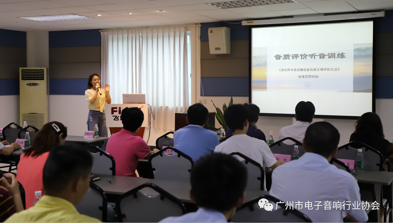 2019年8月3日,在飞达音响培训室举行的行业新标准《演出用专业音响设备音质主观评价方法》宣贯培训活动圆满举行。活动主要从音质评价方法、评价尺度构建、音响设备相关参数、听音员训练、听音室设计、评价节目源等方面展开对中华人民共和国文化行业标准《演出用专业音响设备主观音质评价方法》的宣讲。