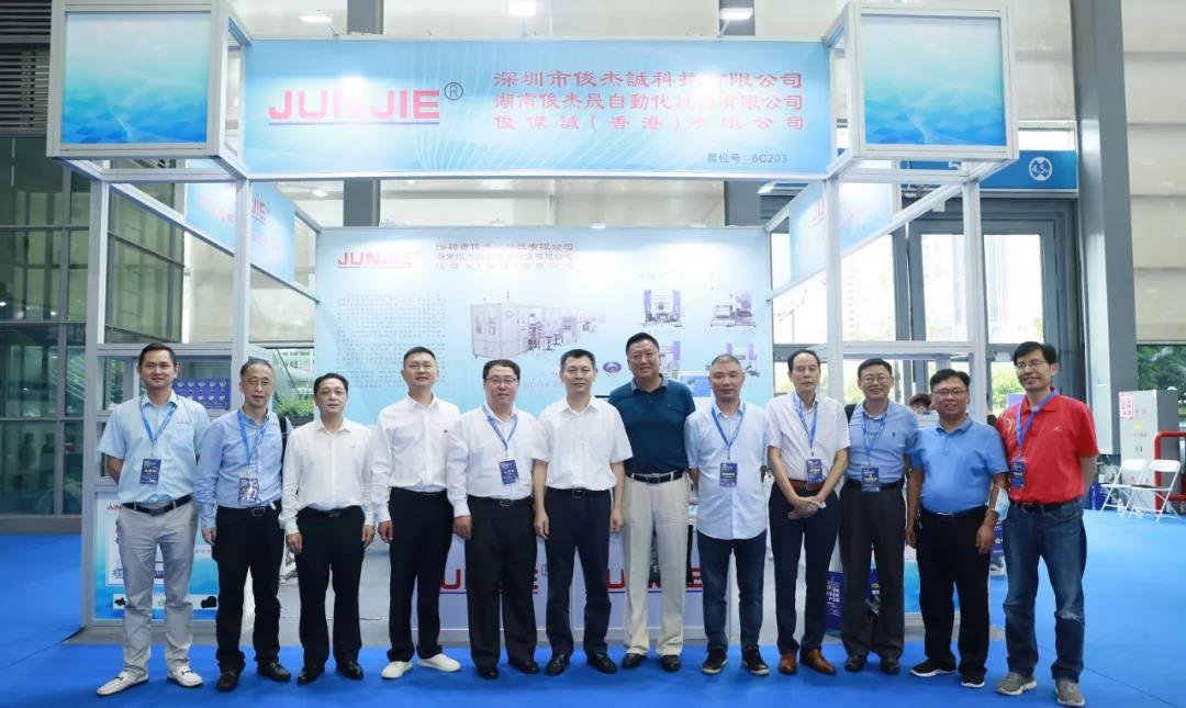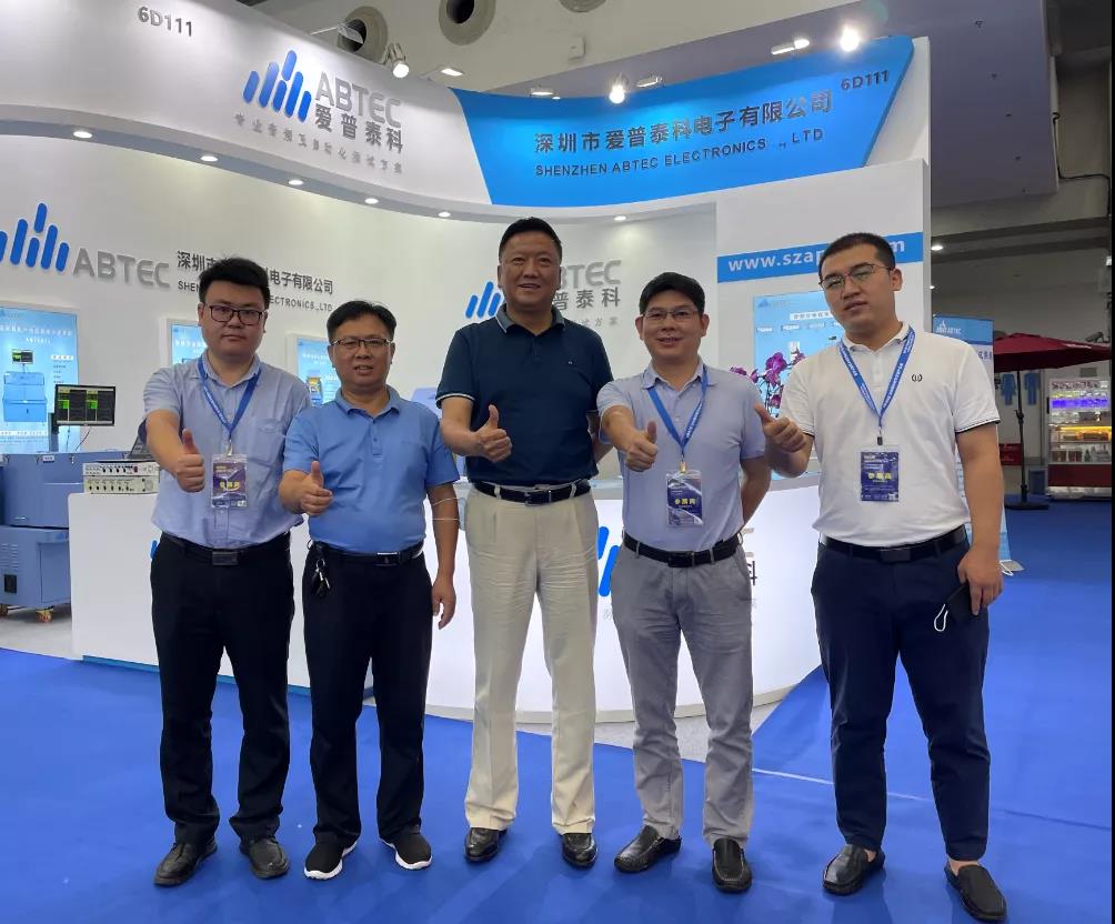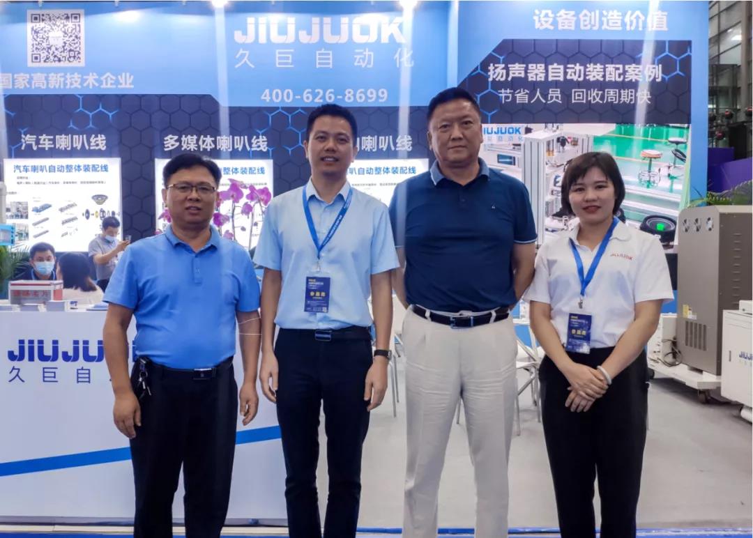 广州市电子音响行业协会执行会长李伟、副会长兼秘书长张昌海在开幕式后走访了参展的协会理事单位深圳市爱普泰科电子有限公司和深圳市久巨工业设备有限公司,并在展位上与企业负责人合影留念。