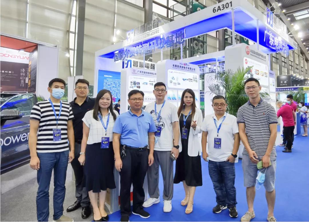 正在负责筹建广东省外贸转型升级基地工作站联盟电子信息专业委员会的张昌海副会长兼秘书长,在展会上也走访了广东省梅州市丰顺县国家外贸转型升级基地(电声产业)集体抱团参展的特装展位,与丰顺县科工商务局、丰顺县电声产业集群管理中心张加宏主任、基地工作站联盟成员丰顺县电声行业商会办公室主任简红霞和参展企业代表进行交流,并合影留念。
