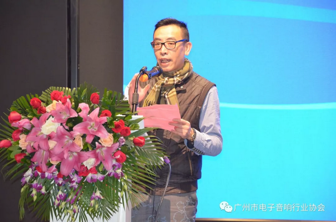 广州市电子音响行业协会会长、奥雷音响CEO李杨春先生首先致辞,他向长期以来给予协会关心、支持和帮助的各级主管部门、专家学者、广大会员企业及社会各界表示衷心的感谢!