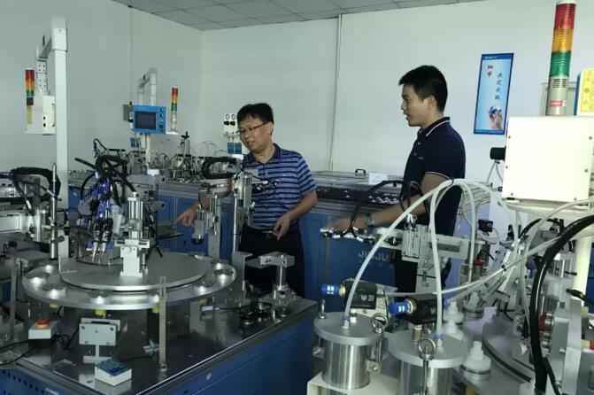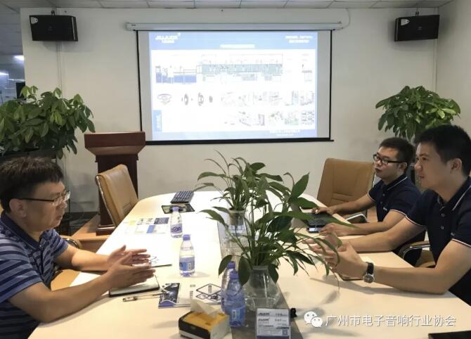 张昌海秘书长向协会理事、久巨设备总经理周鑫对协会的认可表示感谢。他介绍了今年来协会工作的开展情况和近期的主要安排,听取了周鑫总经理对久巨设备的详细情况介绍和对协会工作的建议与需求。久巨设备公司总经理周鑫向张秘书长一行详细介绍久巨的发展历程、设备研发、制造及销售情况,久巨是一家成立仅9年的中小型企业,从零开始到现在拥有80多位研发及技术人才,久巨已经处于电声自动化行业领先水平;目前拥有各项专利超过100项,产品广泛应用于设备点胶、磁性材料的磁化、电声自动化及机器人应用等。周总表示,人才是久巨设备最宝贵的财富和资源,也是公司的竞争优势所在。张秘书长对久巨设备不到十年的发展取得的可喜成绩表示高兴,对公司注重研发和创新表示赞赏,当听到周鑫总经理谈到公司人均产值排在深圳沙井街道的前十位时,感到由衷的敬佩,称赞久巨设备公司人员高素质、产品高技术、企业高效益。希望久巨设备积极参与协会8月份即将举办的论坛活动,为推进广州市电子音响产业的自动化进程发挥更大的作用。