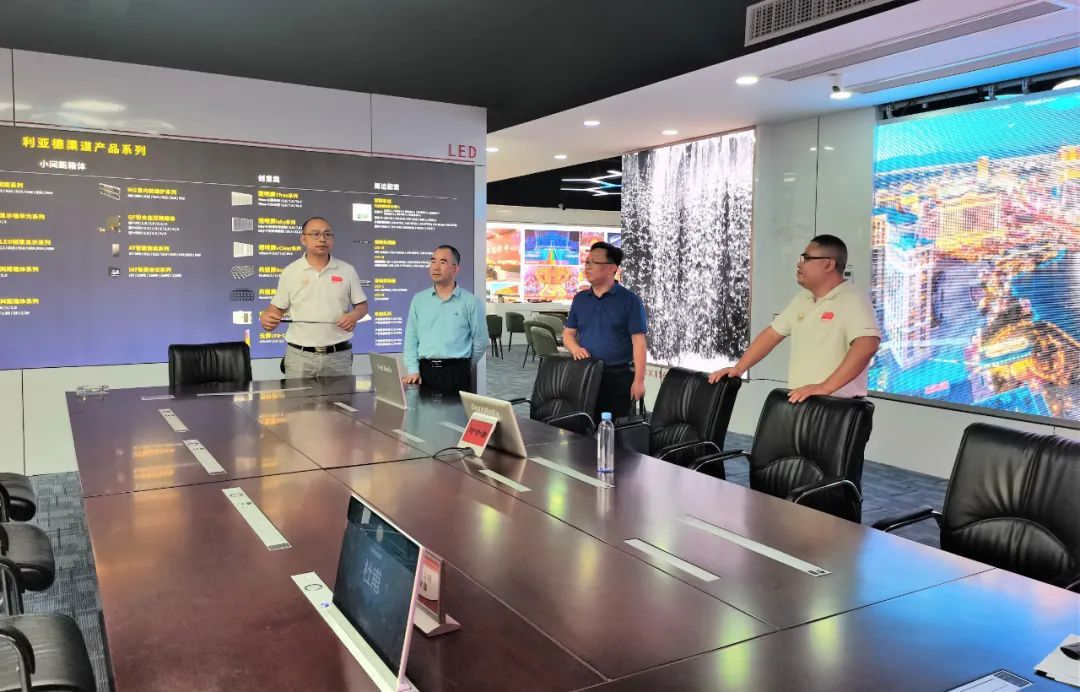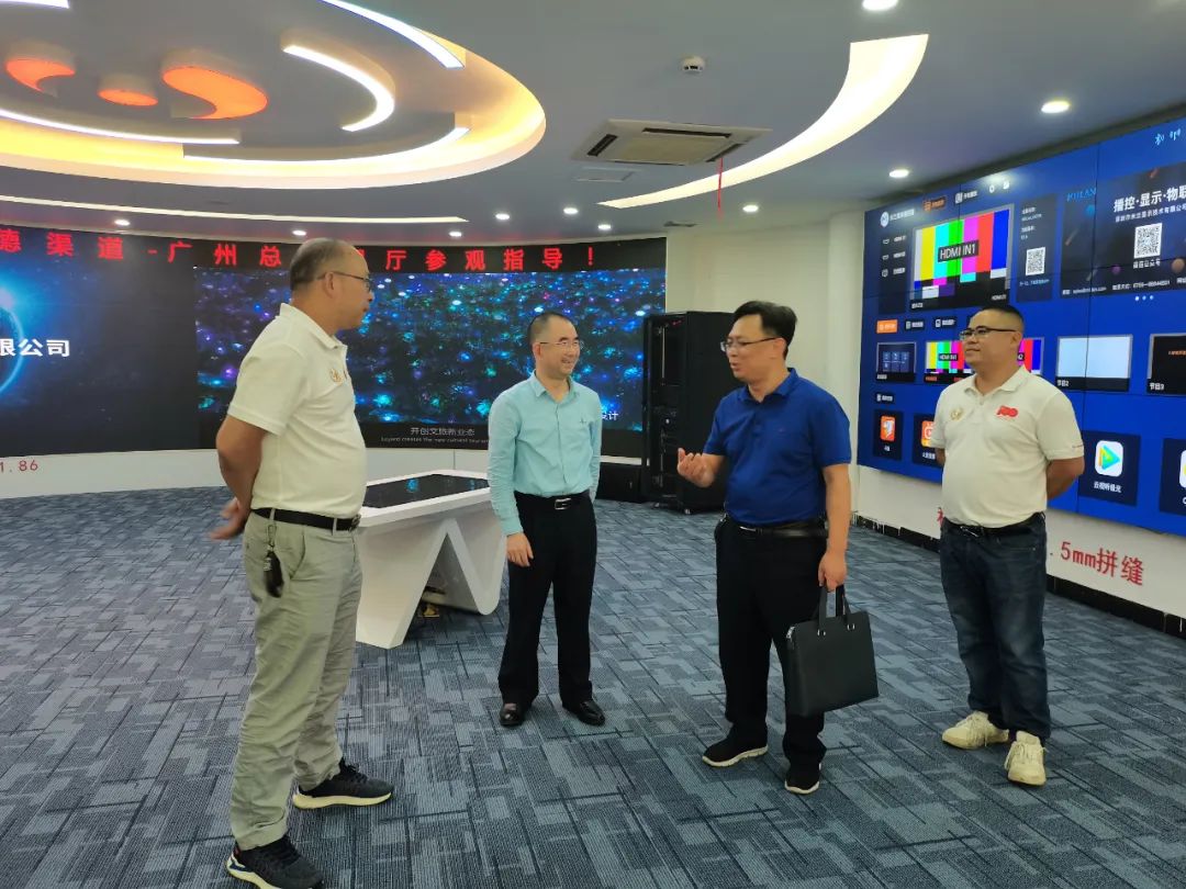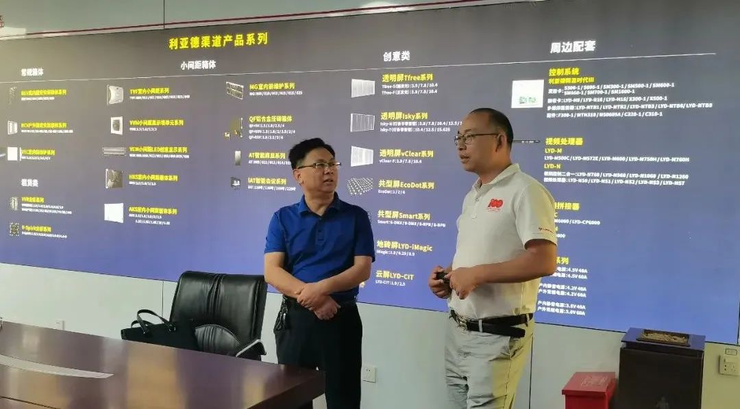 在胡赞松总经理的陪同下,张昌海一行参观了“利亚德”广东渠道·广州总部视听科技终端展厅,胡赞松总经理根据不同产品呈现的效果,分别介绍了对应产品的参数、性能和技术。向张昌海一行介绍了利亚德从2008年奥运的梦幻五环、巨型LED地屏画卷,到2022年北京冬奥的世界最大LED三维立体舞台,利亚德作为深度参与北京两届奥运盛会的“双奥之企”,为系列冰雪赛事的运行保驾护航的事宜,他说,利亚德目前有不同系列和品牌的产品,虽然公司技术和产品在市场上领先,但并不是所有产品都是高价位,公司可为客户提供高性价比的产品和服务。