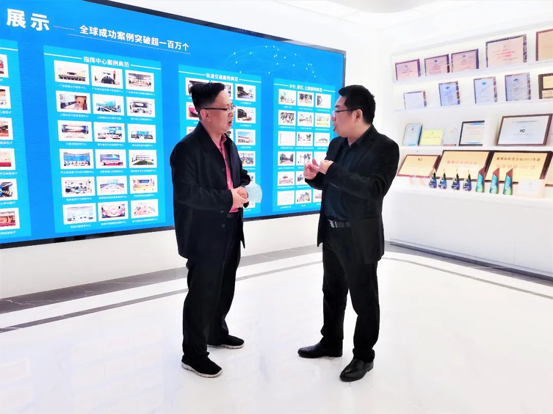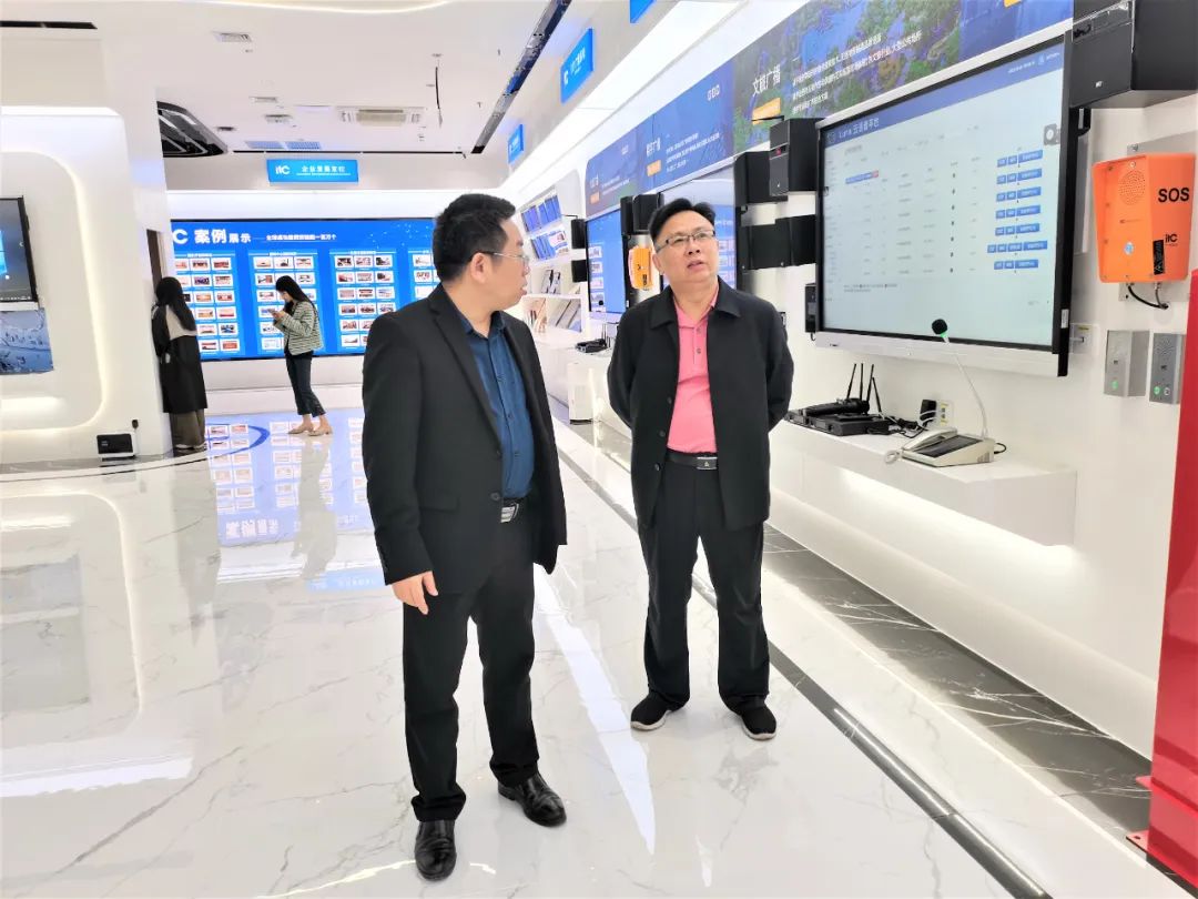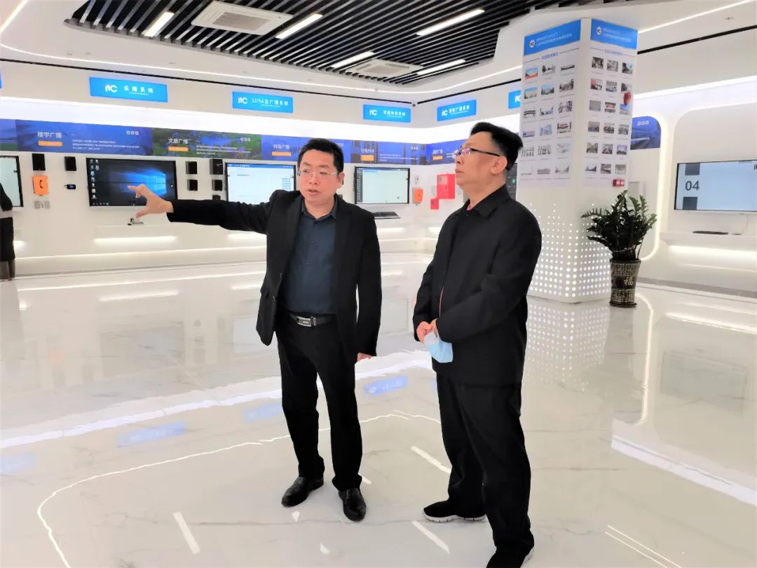 在张柏龙总监的陪同下,张昌海等人参观了保伦电子itc智慧体验馆,张柏龙总监向张昌海介绍了公司的发展历程、企业文化、未来的发展规划,以及各系统产品的应用;在张柏龙总监的指引下,深入了解了广播展区、互动展区、会议室展区等系统及智慧城市、智慧教育、智慧场馆、智能灯光等应用,亲身体验了视听体验室中专业扩声系统、舞台灯光系统、LED显示屏系统搭配不同音乐带来的沉浸式视听效果。