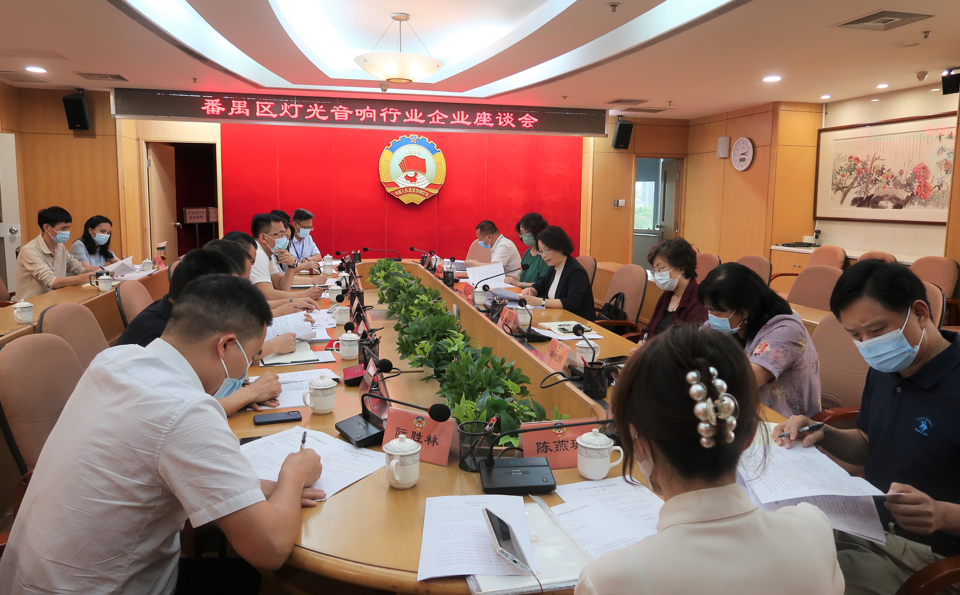 2022年5月6日下午,番禺区政协主席覃海深主持召开番禺区灯光音响行业企业座谈会,研究贯彻落实“链长制”工作要求,推动灯光音响产业链建设。