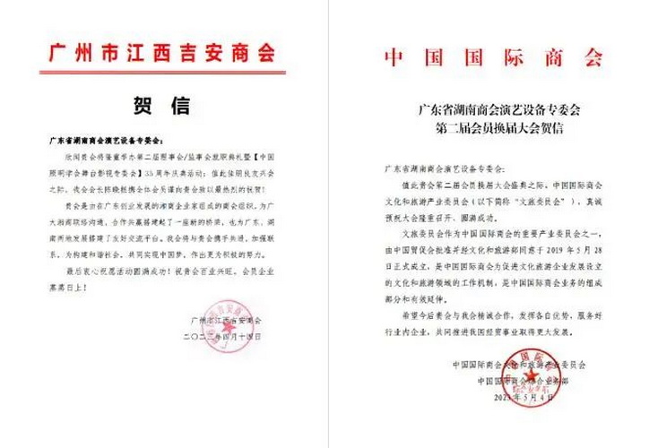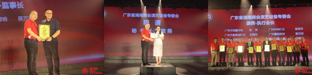 2023年5月9日,由广东省湖南商会演艺专委会(以下简称“湖南演艺专委会”)与中国照明学会舞台影视专委会共同策划的广东省湖南商会演艺设备专委会第2届理事会/监事会就职典礼暨中国照明学会舞台影视专委会35周年庆典活动在佛山南海成功举办。广州市电子音响行业协会(以下简称“广音协”)副会长兼秘书长张昌海、办公室主任李灵燕受邀出席活动。
