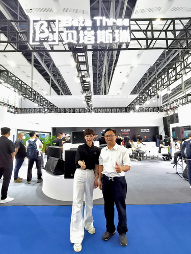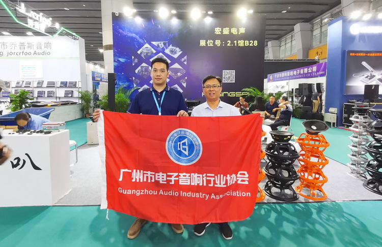 走访广州宏盛电声有限公司展位,与公司总监周炜杰(左)合影↑