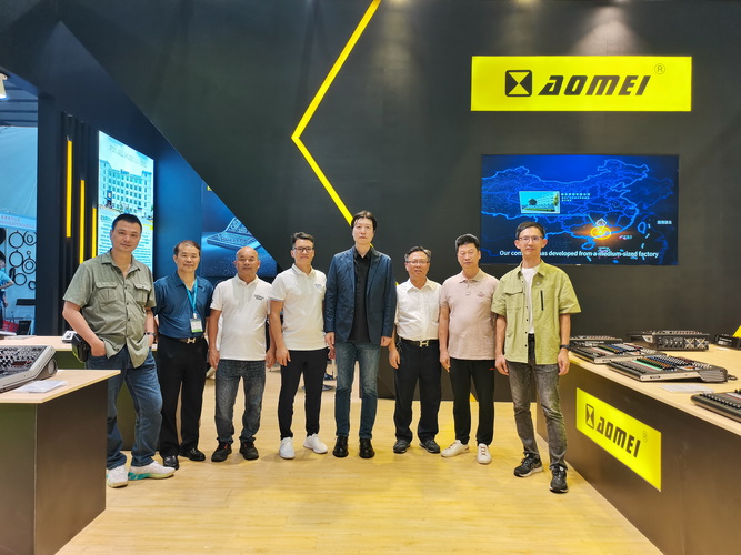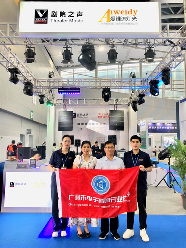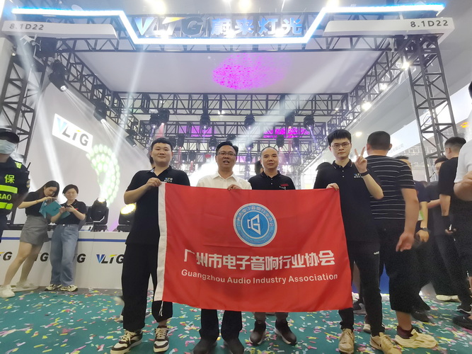 走访广州市爱维迪灯光音响设备有限公司展位,与公司总经理张秀球(左2)等人合影↑