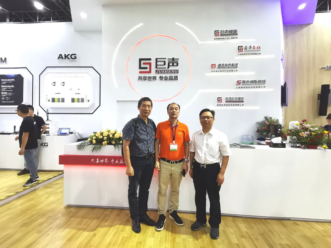 走访巨声视听科技(广州)有限公司展位,与公司总经理陈建威(中)、李力天老师(左)合影↑