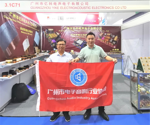走访广州市亿科电声电子有限公司展位,与公司总经理陈国辉(右)合影↑