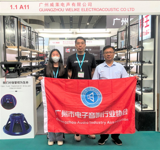 走访广州威莱电声有限公司展位,与公司总经理王启烽(中)等人合影↑