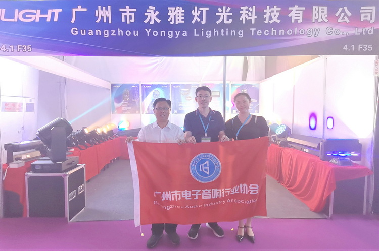 走访广州市永雅灯光科技有限公司展位,与公司总经理袁延国(中)等人合影↑