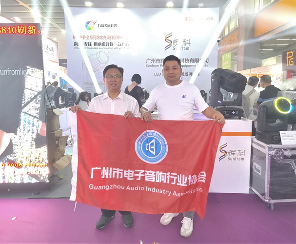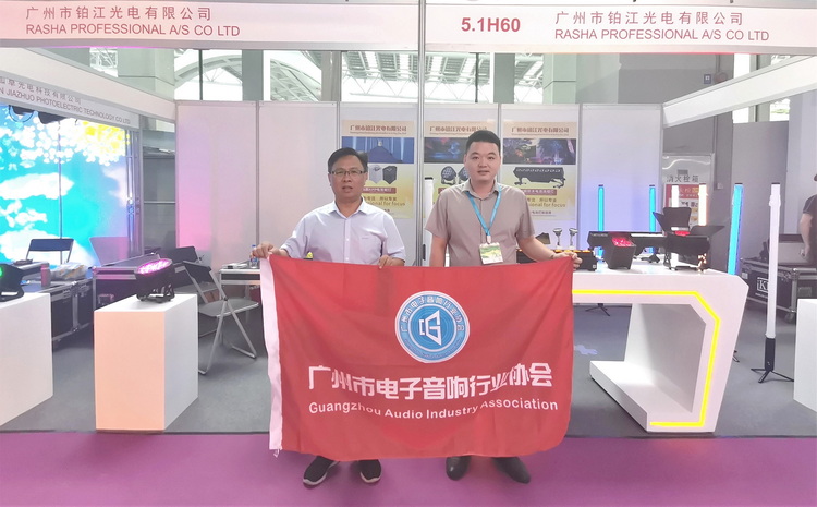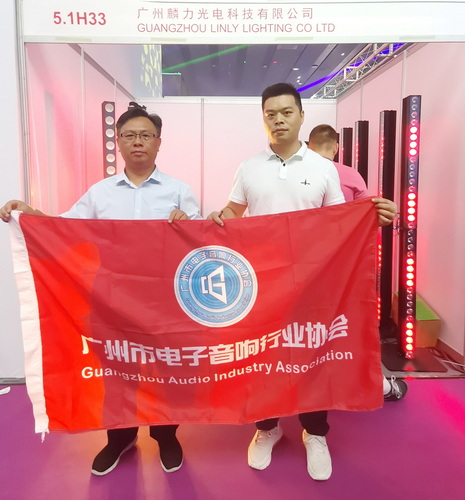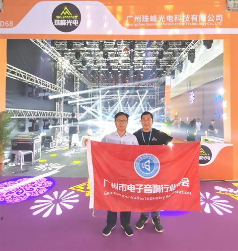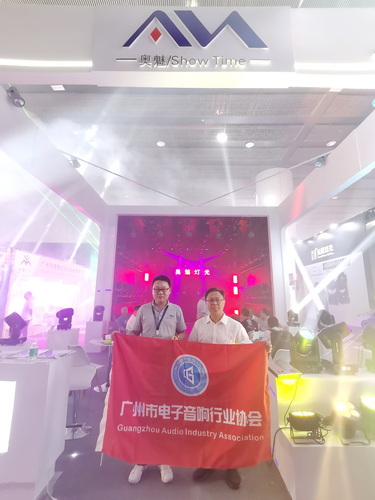 走访广州杰城演艺设备有限公司展位,与公司总经理梁金平(左)合影↑