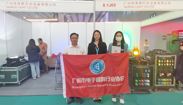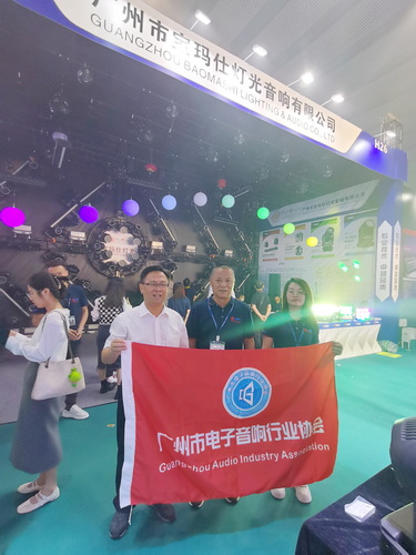 走访广州市宝玛仕灯光音响有限公司展位,与公司总经理李基业(中)等人合影↑