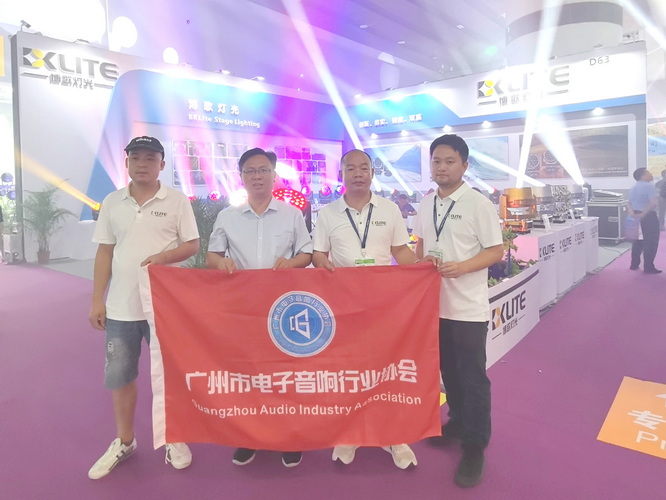 走访广州市博歌舞台灯光设备有限公司展位,与公司总经理黄付常(右2)等人合影↑