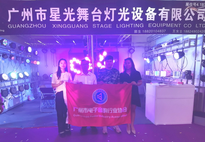 走访广州市星光舞台灯光设备有限公司展位,与公司总经理郭新新(右2)等人合影↑