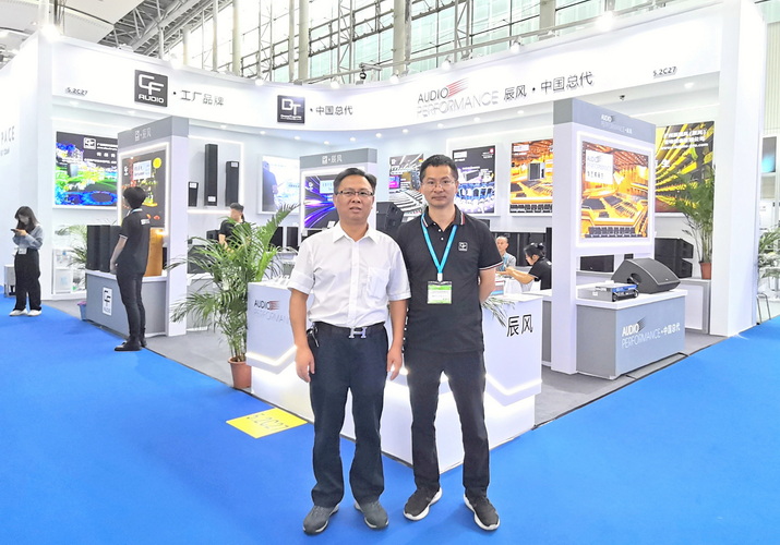 走访广州辰润风音响设备有限公司展位,与公司总经理张海涛(右)合影↑