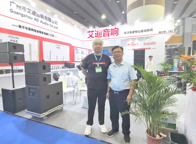 走访广州市艾迪音响有限公司展位,与公司总经理包建军(左)合影↑