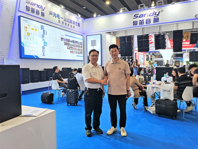 走访广州尚威音响设备有限公司展位,与公司总经理唐南侠(左)合影↑