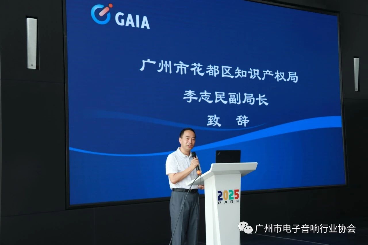 广州市花都区知识产权局李志民副局长为广州市电子音响行业知识产权“示范企业”的单位授牌。